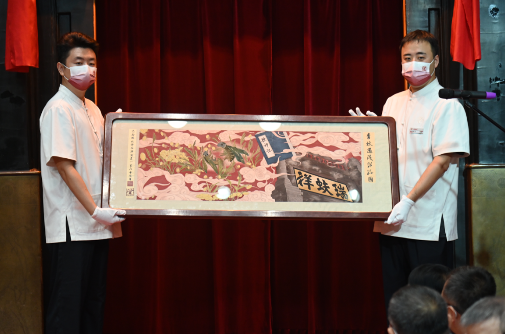在本次庆典活动展品中有一个很特殊的缂丝画卷作品,是向瑞蚨祥160周年庆献礼的经典之作,缂丝画卷将“青蚨还钱”的故事织造其中。缂丝从宋元以来一直是皇家御用织物之一,因织造过程极其精细,常有“一寸缂丝一寸金”和“织中之圣”的盛名。画作使用上百种颜色的丝线,由三位绣娘经数月手工织造完成,唯美华贵,超凡脱俗,成为瑞蚨祥典藏的传世精品。