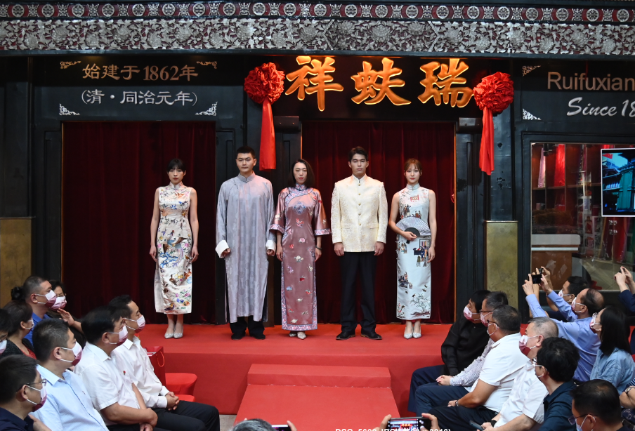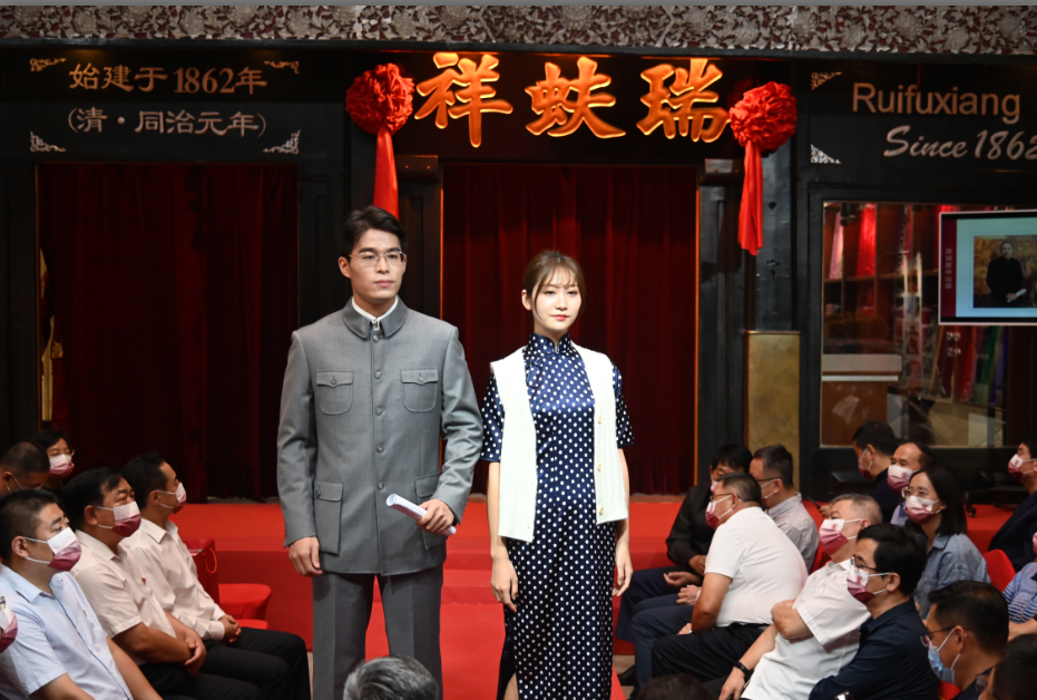 在庆典现场还举办了以“百年衣裳”为主题的服装走秀,置身于有百年历史的瑞蚨祥大栅栏老店,为服装秀增添了身历其境的历史文化感受。模特展示了从民国服装、京派旗袍,再到国潮服饰的演变,身着绫罗绸缎手工制成的各式精美服装,细节之处可见盘扣、刺绣、绲边等精工细作的风采,让现场观众沉浸式感受瑞蚨祥非遗技艺的精湛,以及中国民族传统服装服饰的瑰丽和唯美。