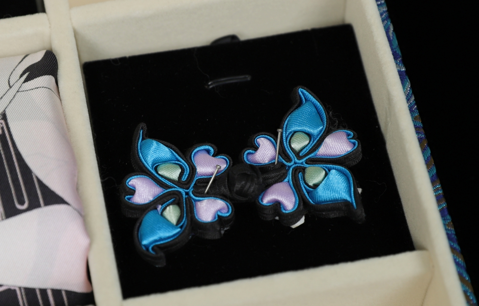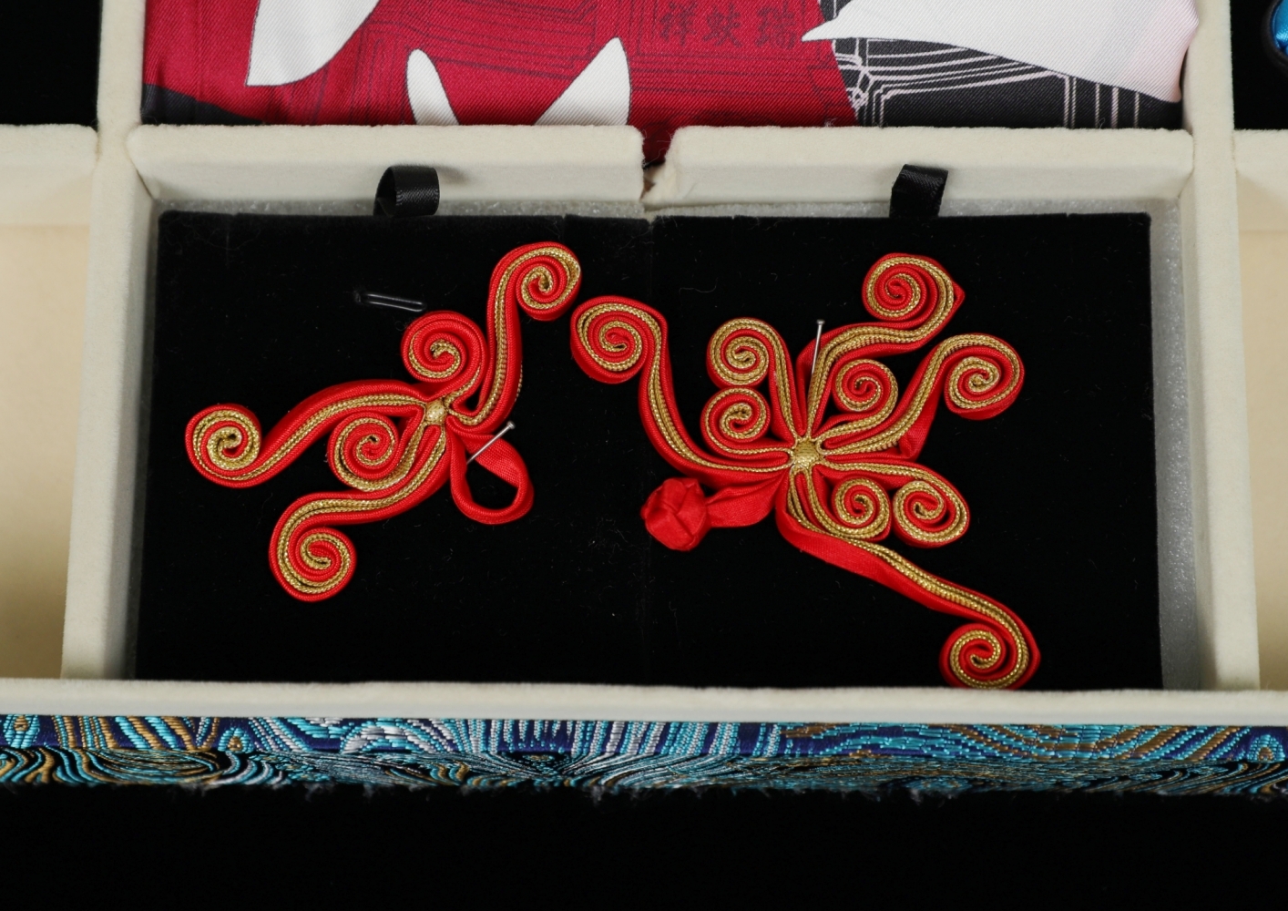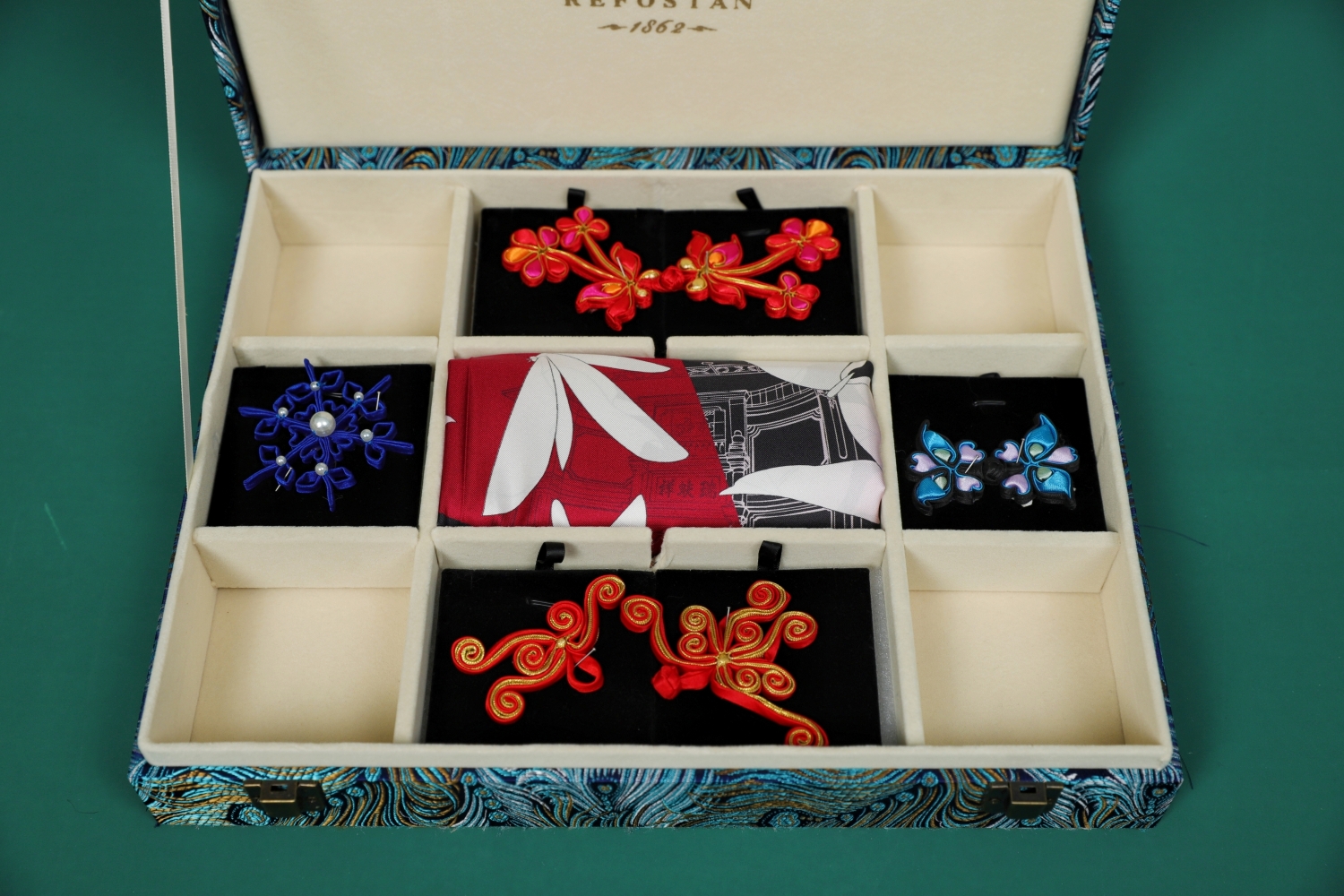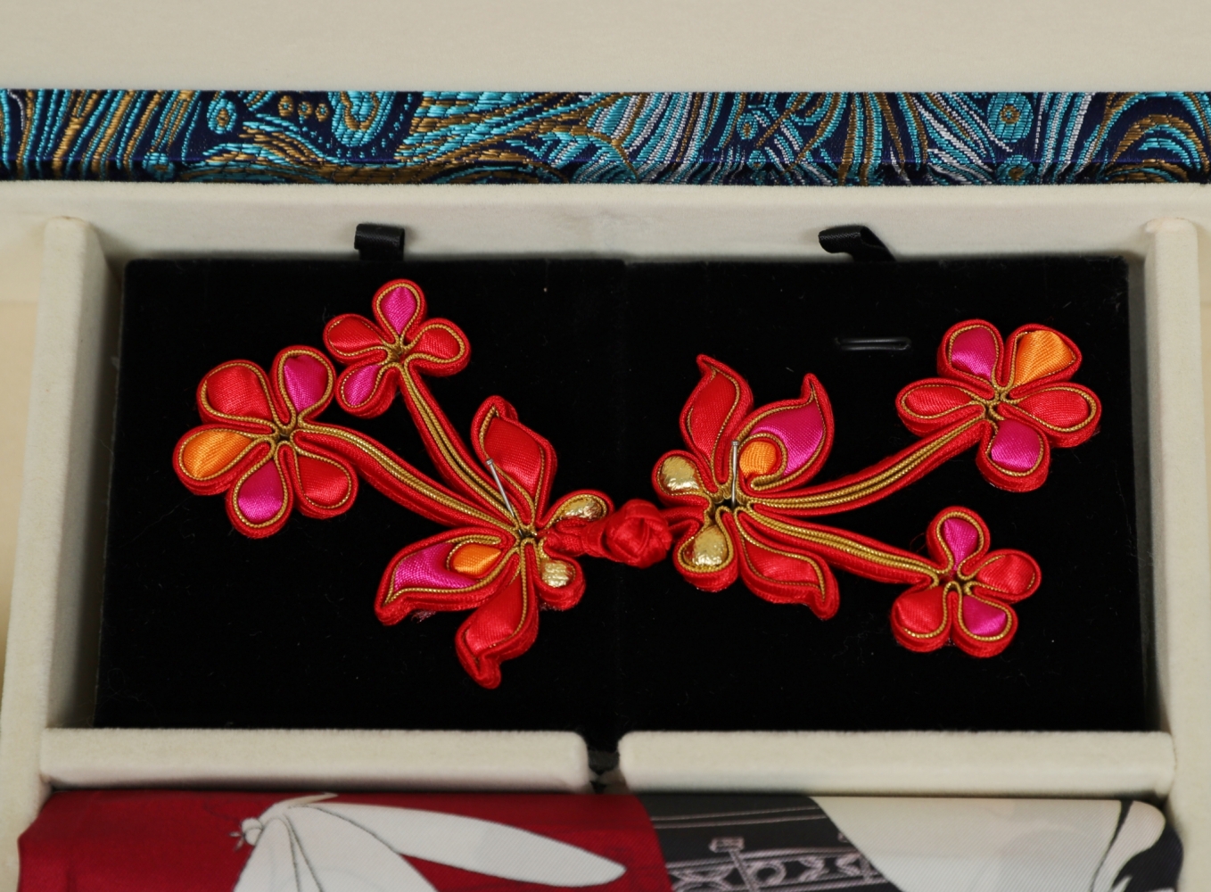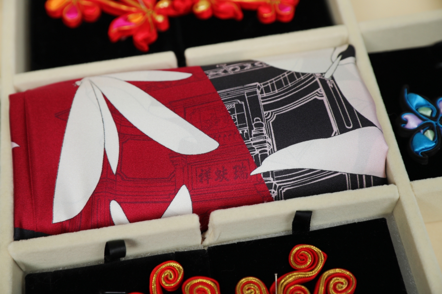 这份极具中式美学文化底蕴的礼物包含一条真丝丝巾和四枚精致的手工盘扣,展示了中式服装手工技艺之美和深厚的文化内涵,也代表了对法国人民的美好祝福。