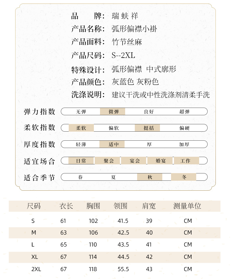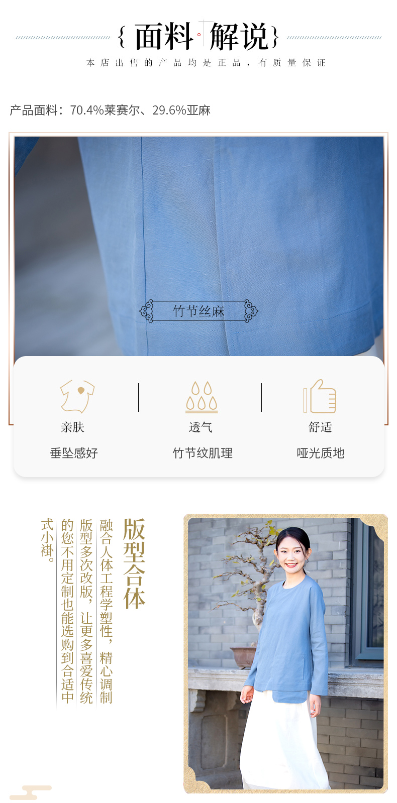 版型合体,融合人体工程学塑性,精心调制版型多次改版,让更多喜爱传统的您不用定制也能选购到合适中式小褂。