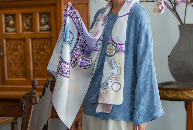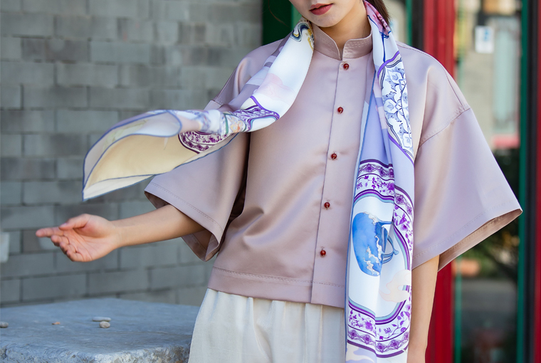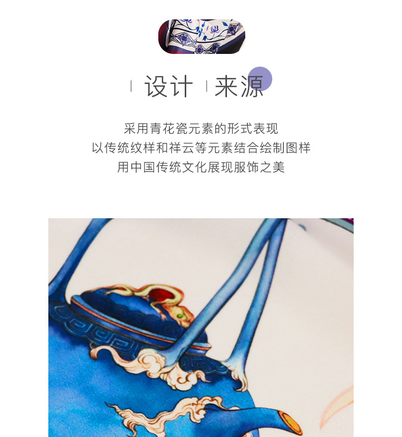采用青花瓷元素的形式表现,以传统纹样和祥云等元素结合绘制图样,用中国传统文化展现服饰之美。