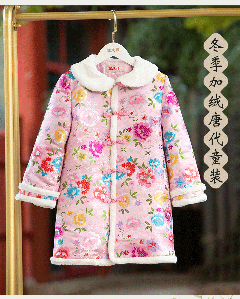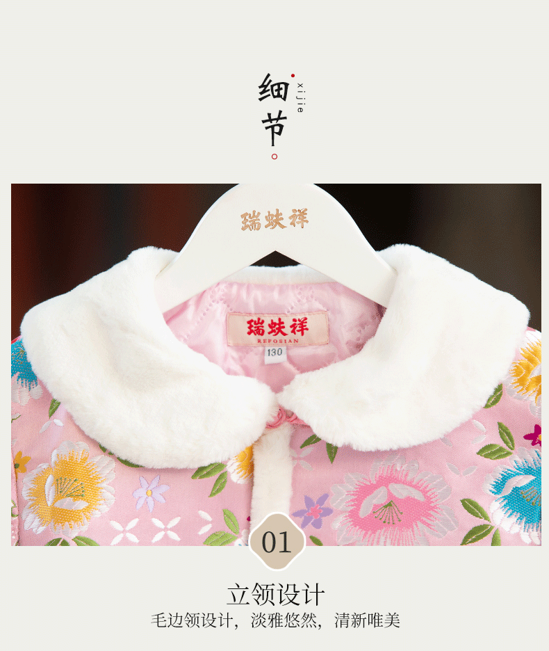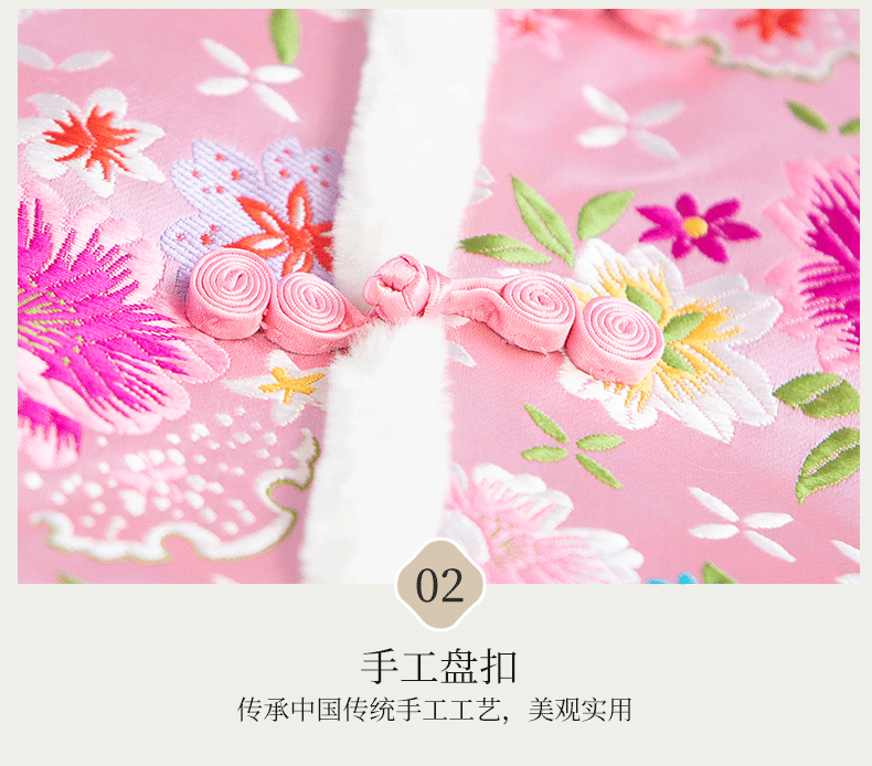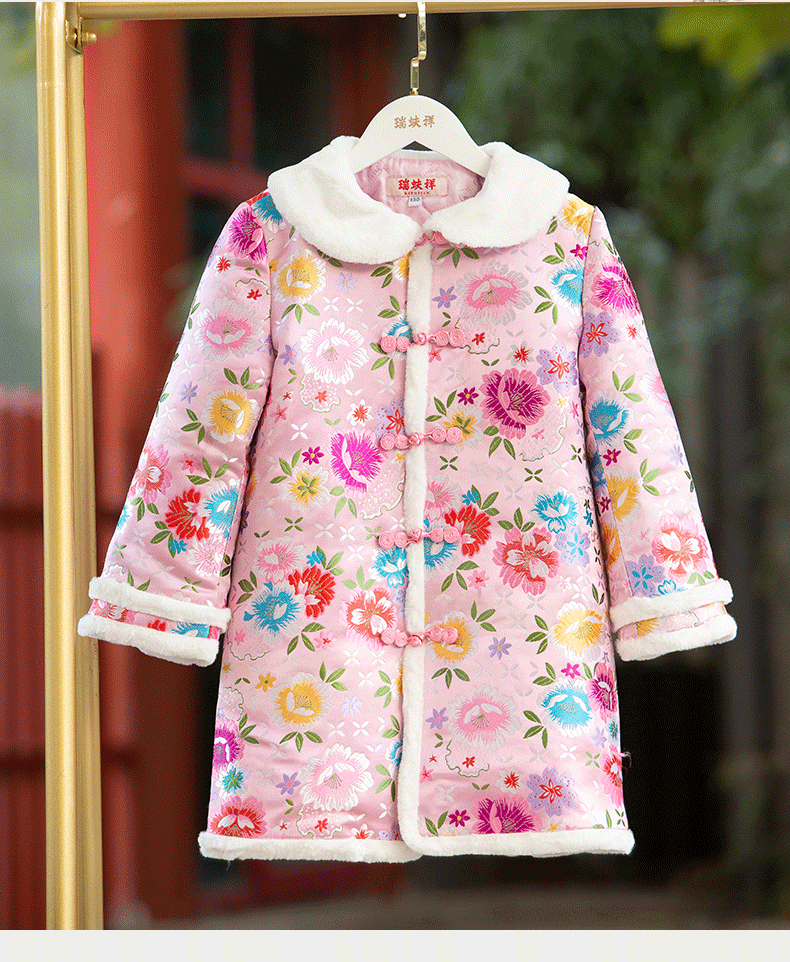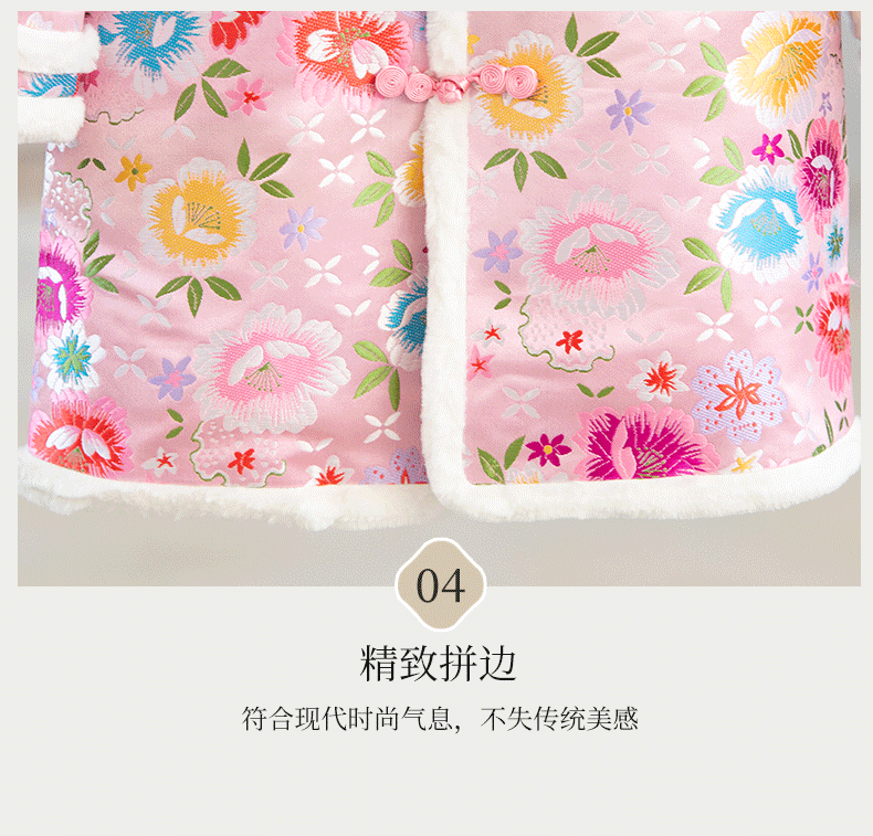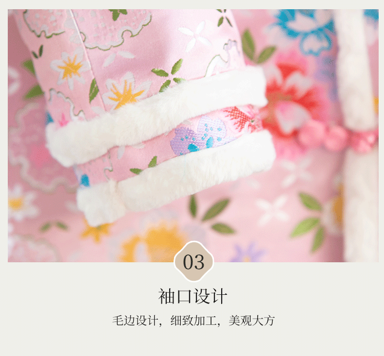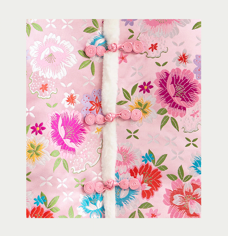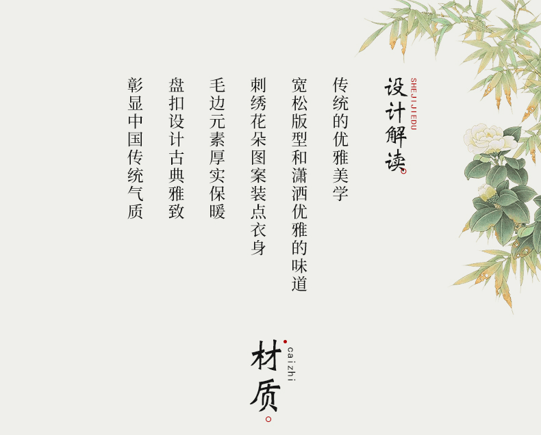 传统的优雅美学,宽松版型和潇洒优雅的味道,刺绣花朵图案装点衣身,毛边元素厚实保暖,盘扣设计古典雅致,彰显中国传统气质。