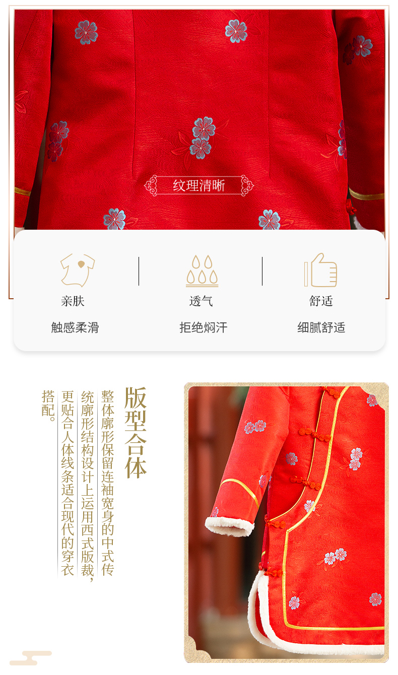 圆角小立领符合肩颈曲线,舒适且有中式传统的仪式感。精细拼边符合现代时尚气息,不失传统的美感。