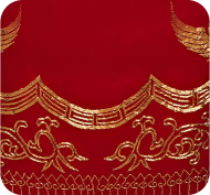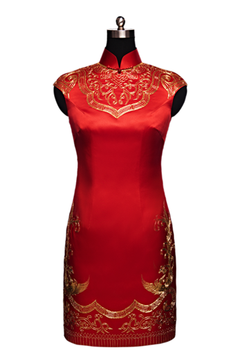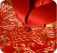 产品/绣品图案说明:大红真丝皱缎面料配以手工盘绣花,胸前的盘金如意图案包含了吉祥喜庆的美好寓意。“凤凰相对盘金缕,牡丹一夜经微雨”,金缕的凤凰盘对相依,格外的雍容富丽。