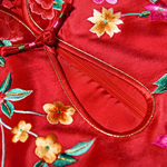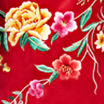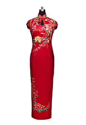 产品/绣品图案说明:(手推绣)大红色面料,轻盈飘逸,肩与胸前错落的牡丹花雍容盛开,犹如佳偶的爱情甜蜜绽放。不同于其他牡丹花争奇斗艳,而将错落的小牡丹花缠绕于腰间,凸显佳人婀娜多姿的身材。