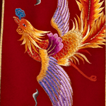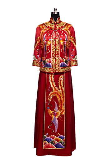 产品/绣品图案说明:一飞冲天的五彩鸾凤赋予人们积极向上的精神,淋漓尽致的展现了中国传统文化中祁吉纳样的寓意,古朴的款式婉约雅韵、风华绝代。上下分身的中式套装款式,经过对传统服装制式的调整更加修身。对襟的上衣两边相互对称的彩凤绣花,光彩夺目、庄重霸气。