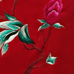 产品/绣品图案说明:采用新型麻缎面料,挺括有型垂坠感强。红色的宽绲边中间的…道细细的绿色精致细腻。领口处手工盘制的花扣,是传统工艺的完美体现。“富贵风流拔等伦百花低首拜方尘”,在新婚时刻,美丽绝伦的新娘就是此等的风姿。