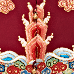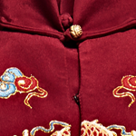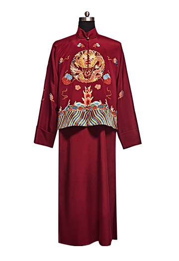 产品/绣品图案说明:(手绣)长袍马褂是传统的男士喜服、酒红色的重磅真丝面料上彩色团龙的圈金绣花,下摆五彩江崖海水绣花、寓意福山寿海、常饰于古代龙袍、官服下摆的吉祥纹饰并有彩色祥云点缀其间。传统的平绣、打籽绣与圈金绣的结合是传统工艺的完美体现。