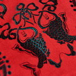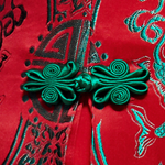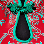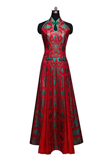 产品/绣品图案说明:红色精美真丝织锦缎面料,绿色双鱼图案象征着年年有余,金玉良缘。领口的水滴设计拉长了新娘的颈部线条,配合露背设计时尚大气。下摆A字型裙摆中间加入百褶设计雍容华贵。